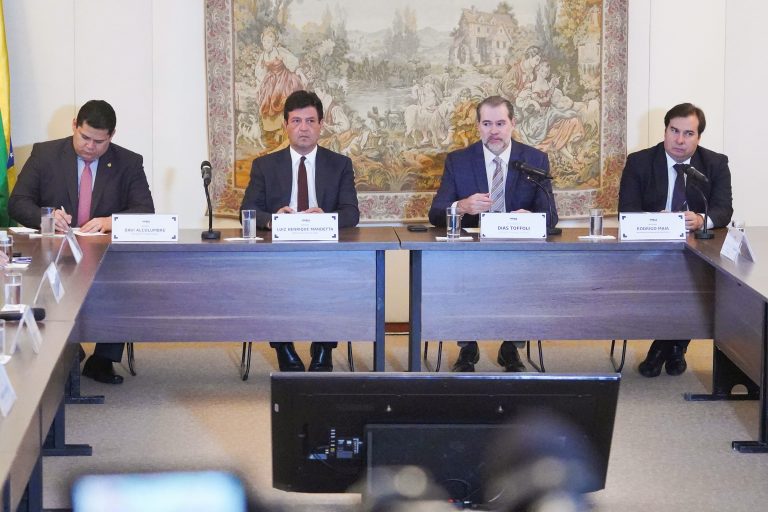 O ministro da Saúde, Luiz Henrique Mandetta, apresentou informações aos presidentes da Câmara, Rodrigo Maia; do Senado, Davi Alcolumbre; e do Supremo Tribunal Federal (STF), Dias Toffoli, sobre o funcionamento das Casas durante a epidemia de coronavírus.