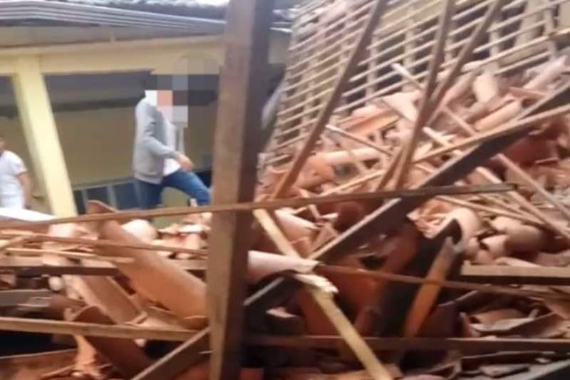 Abaixo, um vídeo que circulou por redes sociais, mostra o momento em que a estruturadesaba, assustando os alunos que estão na área.