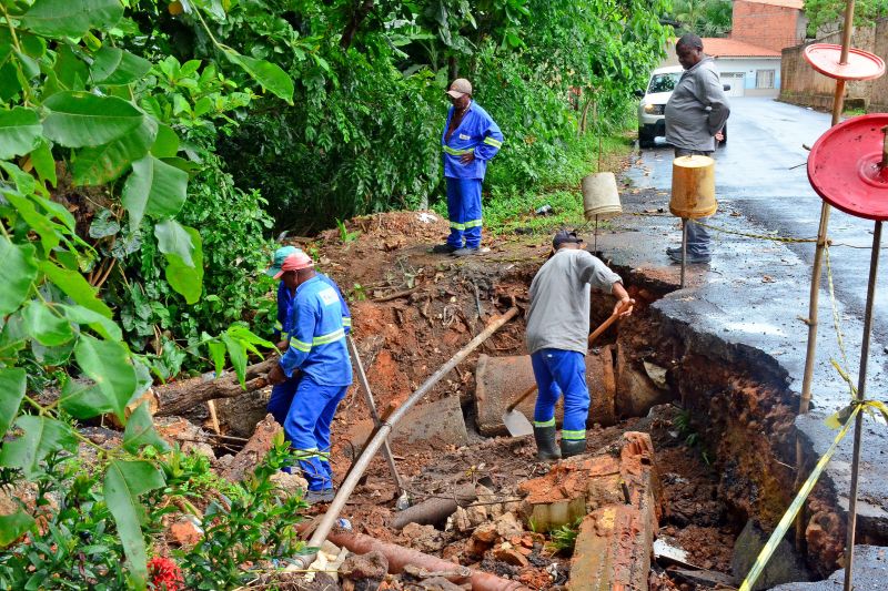 No bairro Recanto dos Vinhais, as equipes de manutenção trabalham na restauração de um trecho da rua Santo Antônio, que está sendo destruída aos poucos pela erosão, decorrente das fortes chuvas do período. O problema atingiu a tubulação pluvial e a rede de abastecimento de água potável.