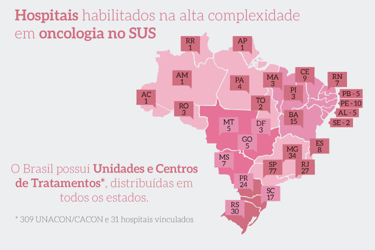 Atualmente existem 309 unidades e centros de assistência habilitados no tratamento do câncer, distribuídos por todos os estados brasileiros, onde o paciente de câncer encontrará desde exames até cirurgias mais complexas.