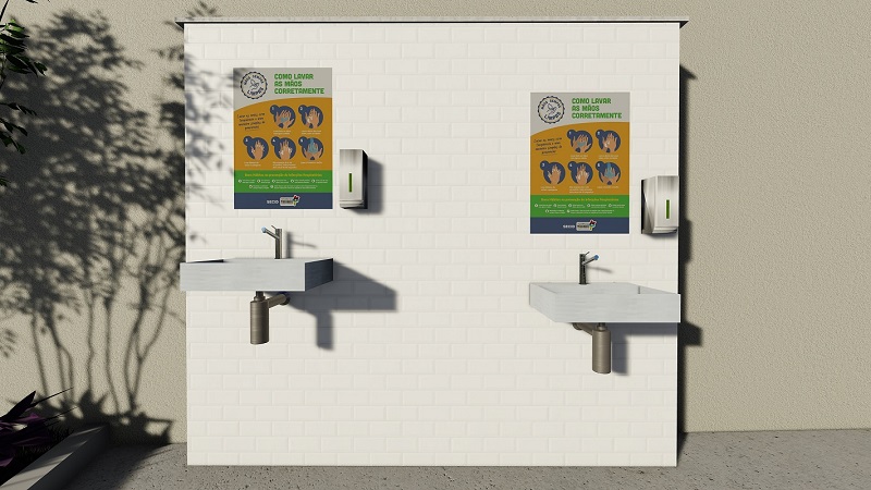 Os módulos sanitários implantados pela Secid são compostos por lavatórios que garantem água limpa, sabão líquido e instruções de higienização adequada.